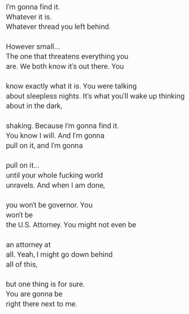 In this monologue Bobby speaks to U.S. Attorney Chuck Rhoades, played by Paul Giamatti. Bobby let’s Chuck know that if he goes down, he will find out Chuck’s secret and take Chuck down with him.